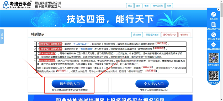 一、进入职业技能考试培训网上报名平台首页 (点此进入),点击“平台首页”【报名查询入口】,输入“个人报名相关信息”查询“报名记录”;