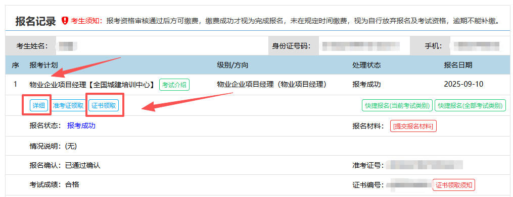 二、在考生考试报名记录页面,点击“报名记录”栏里的【详细】进入个人“报名信息详细页面”或点击【证书领取】进入选择领取方式;