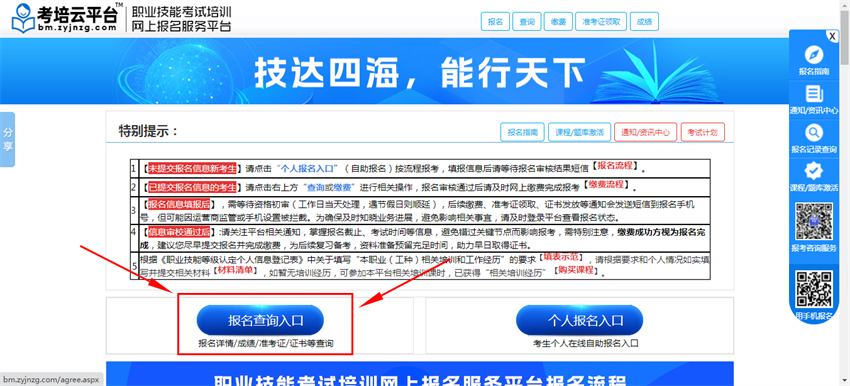 一、进入“职业技能考培平台”首页 (点此进入),点击首页右上方【查询】,输入个人报名相关信息查询考试报名记录;