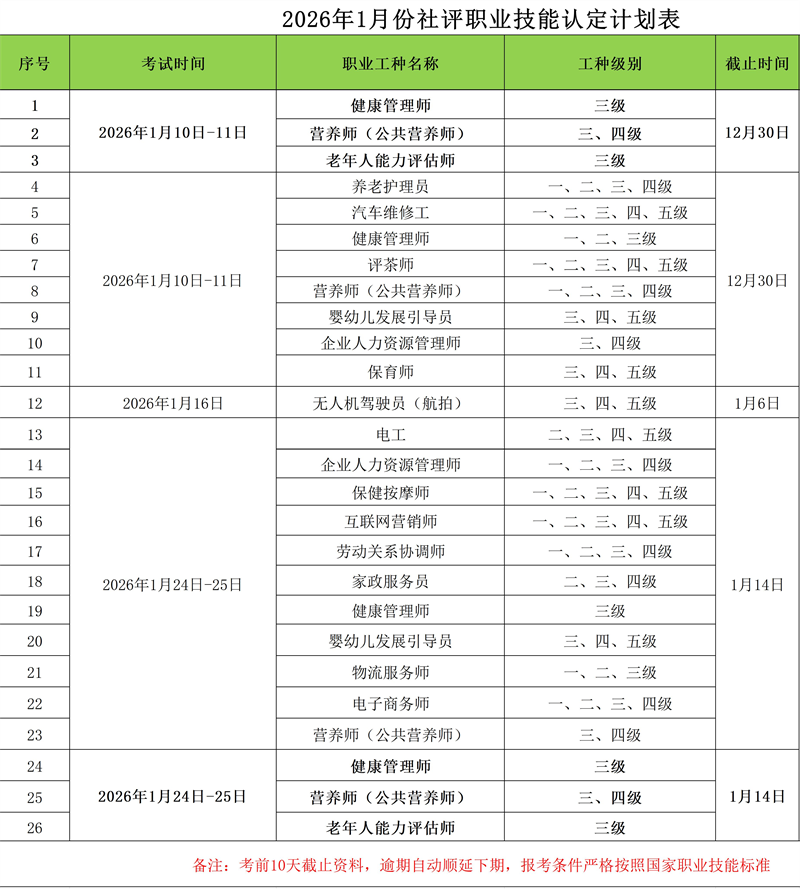 【考试安排】2026年1月批次职业技能等级认定考试:婴幼儿发展引员(育婴员)、企业人力资源管理师、评茶师、电工、保育师、健康管理师、汽车维修工、养老护理员、营养师、无人机驾驶员(航拍)、养老护理员、物流服务师等职业技能等级认定考试通知