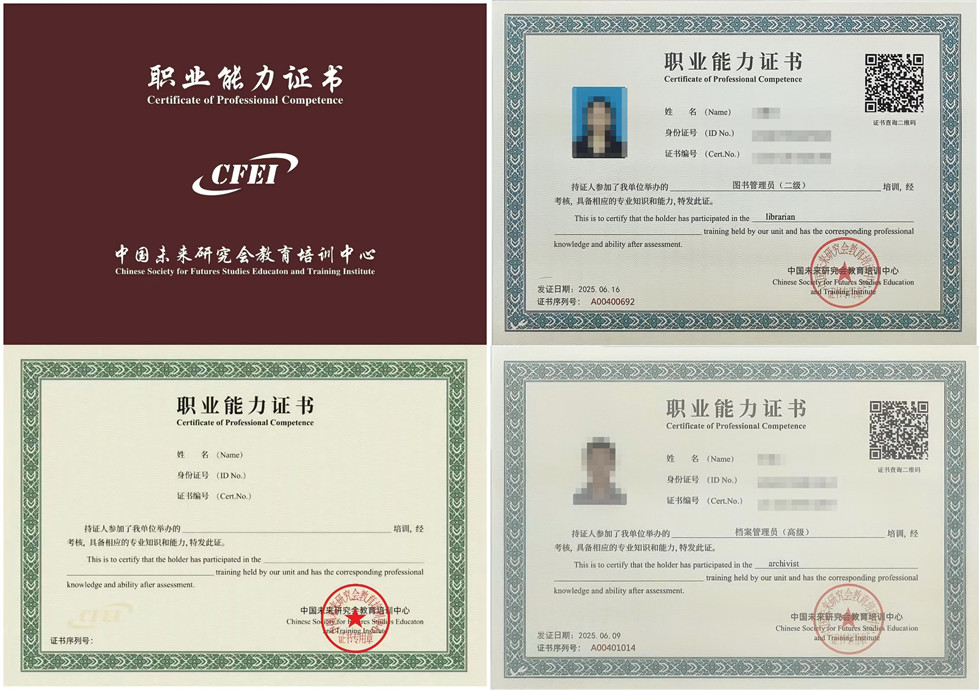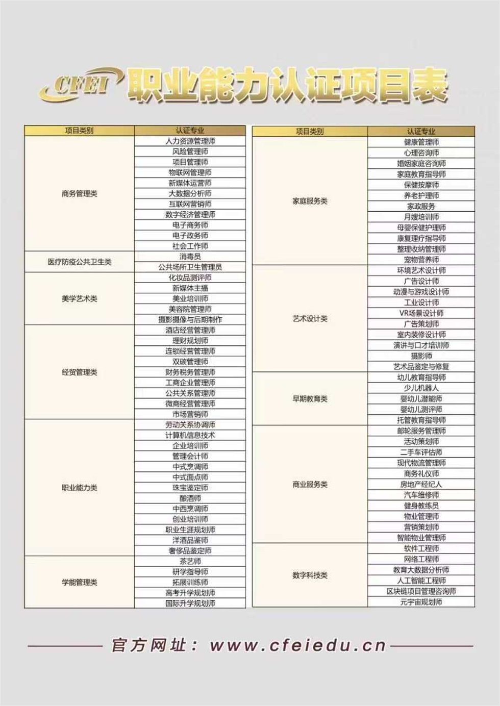 中国未来研究会教育培训中心: 档案管理员、档案信息化管理师、图书管理员、宠物营养师、宠物殡葬师、动物疫病防治员、无人机操作员、化妆师、风险管理师、项目管理师、珠宝鉴定师、酿酒师、创业培训师、职业生涯规划师、洋酒品鉴师、奢侈品鉴定师、拓展训练师、宠物营养师、化妆品测评师、新媒体主播等岗位能力证书项目报考说明