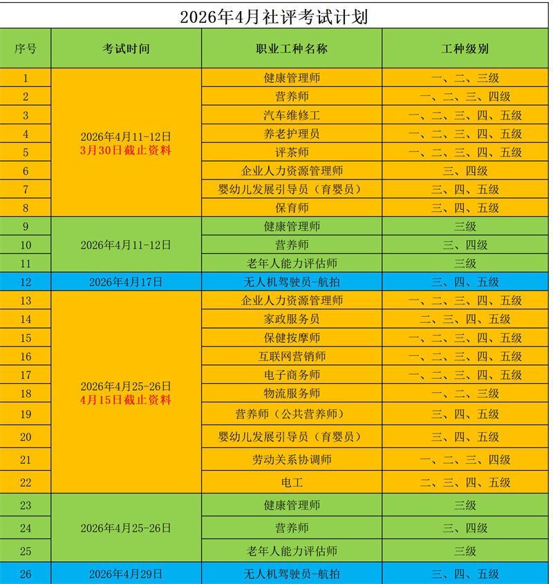 【考试安排】2026年4月批次职业技能等级认定考试:婴幼儿发展引员(育婴员)、企业人力资源管理师、评茶师、电工、保育师、健康管理师、汽车维修工、养老护理员、老年人能力评估师、营养师、无人机驾驶员(航拍)、养老护理员、物流服务师、保健按摩师、互联网营销师、电子商务师、劳动关系协调师、家政服务员等职业技能等级认定考试通知